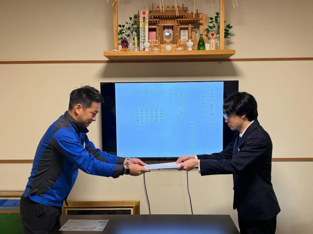 入社式では、社会人としての第一歩を踏み出す決意を聞き、